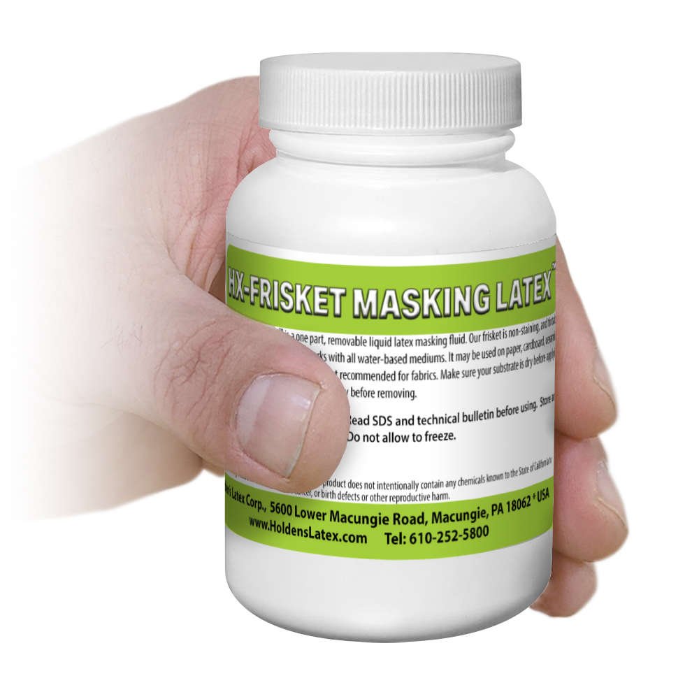 Holden's HX-Frisket Masking Latex™ is een vloeibare verwijderbare latex maskeervloeistof. Ons maskeervloeistof is niet-vlekkend en kleurbaar en werkt met alle mediums op waterbasis. Het kan worden gebruikt op papier, karton, keramiek, glas, leer, metaal, papier en hout. Het wordt niet aanbevolen voor stoffen. Zorg ervoor dat uw ondergrond droog is voordat u het aanbrengt en zorg ervoor dat de maskeervloeistof volledig droog is voordat u het verwijdert.ALLERGIEËN: Lees het etiket aandachtig. Gebruik dit product niet als u allergisch bent voor rubberlatex. Als u het niet zeker weet, breng het etiket dan naar uw arts voor advies. Als u een allergische reactie ervaart, stop dan met het gebruik en zoek onmiddellijk medische hulp.