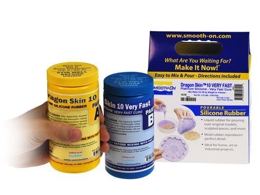 Dragon Skin™ siliconen zijn hoogwaardige platina-uithardende vloeibare siliconen die worden gebruikt voor een verscheidenheid aan toepassingen, van het creëren van skin-effecten en andere SFX effecten tot het maken van productiemallen voor het gieten van een verscheidenheid aan materialen. Vanwege de fysieke eigenschappen en flexibiliteit van Dragon Skin™ siliconen worden ze ook gebruikt voor medische protheses en dempingstoepassingen. Dragon Skin™ wordt ook gebruikt voor een verscheidenheid aan industriële toepassingen en heeft een gebruikstemperatuurbereik van een constante (-53°C tot +232°C).Dragon Skin™ 10 Zeer Snel - Werktijd 4 minuten - Uithardingstijd 30 minuten - Shore A10Geweldig voor het maken van mallen voor een verscheidenheid aan toepassingen — Dragon Skin™ siliconen kunnen worden gebruikt om uitzonderlijk sterke en scheurbestendige mallen te maken voor het gieten van gips, was, beton, harsen en andere materialen.Beproefd, veelzijdig materiaal voor speciale effecten - Zacht, supersterk en rekbaar, Dragon Skin™ wordt over de hele wereld gebruikt om spectaculaire huid- en wezeneffecten te maken. Een oneindig aantal kleureffecten kan worden bereikt door Silc Pig™ siliconenpigmenten of Cast Magic™ effectpoeders toe te voegen. Uitgehard rubber kan ook worden geverfd met Psycho Paint™.Eenvoudig te gebruiken — Dragon Skin™ siliconen worden 1A:1B gemengd op basis van gewicht of volume. Vloeibaar rubber kan worden verdund met Silicone Thinner™ of verdikt met THI-VEX™. Rubber hardt uit bij kamertemperatuur 23°C met verwaarloosbare krimp. Vacuüm ontluchting wordt aanbevolen om luchtbellen in uitgehard rubber tot een minimum te beperken.Dragon Skin™ 10 siliconen zijn vlamgekeurd volgens de UL-94 HB-specificatie en ze voldoen aan de B1-classificatie voor de GB 8624-2012 brandtest voor bouwmaterialen en producten (exclusief 'NV'-formules). Gecertificeerde huidveilig - Uitgehard Dragon Skin™ is huidveilig en is gecertificeerd door een onafhankelijk laboratorium. OESO TG 439-certificering. Bij het testen werden geen dieren gebruikt.