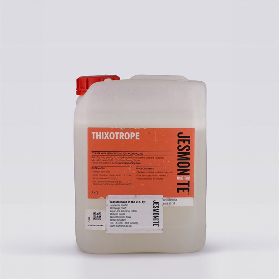 Thixotrope wordt aan het mengsel toegevoegd om het materiaal te verdikken tot een ‘Gel-Coat’ consistentie en zodat de viscositeit van Jesmonite kan worden aangepast aan de voorkeur van de gebruiker. Dit is handig bij het borstelen of spuiten van materialen op mallen met verticale vlakken, omdat het voorkomt dat het materiaal wegzakt.Door Thixotrope toe te voegen, is het mogelijk om een gecontroleerde materiaallaag van 1 - 3 mm aan te brengen zonder dat deze van het oppervlak van de matrijs afloopt. Dit voorkomt ook dat glasversterkingen zichtbaar worden aan het gezicht van gelamineerde objecten. Thixotrope kan ook worden gebruikt om van het materiaal een pasta te maken, die kan worden gebruikt als reparatievulmiddel en voegpasta voor het aan elkaar lijmen van twee laminatenThixotrope wordt toegevoegd aan het mengsel na de poeders en wordt gemengd met behulp van het High Shear-mengblad. Voeg druppel voor druppel toe totdat de gewenste consistentie is bereikt. Typische insluitingspercentages per gewicht zijn 2 g - 6 g per kilo mengselThixotrope is niet compatibel met AC730 of AC830