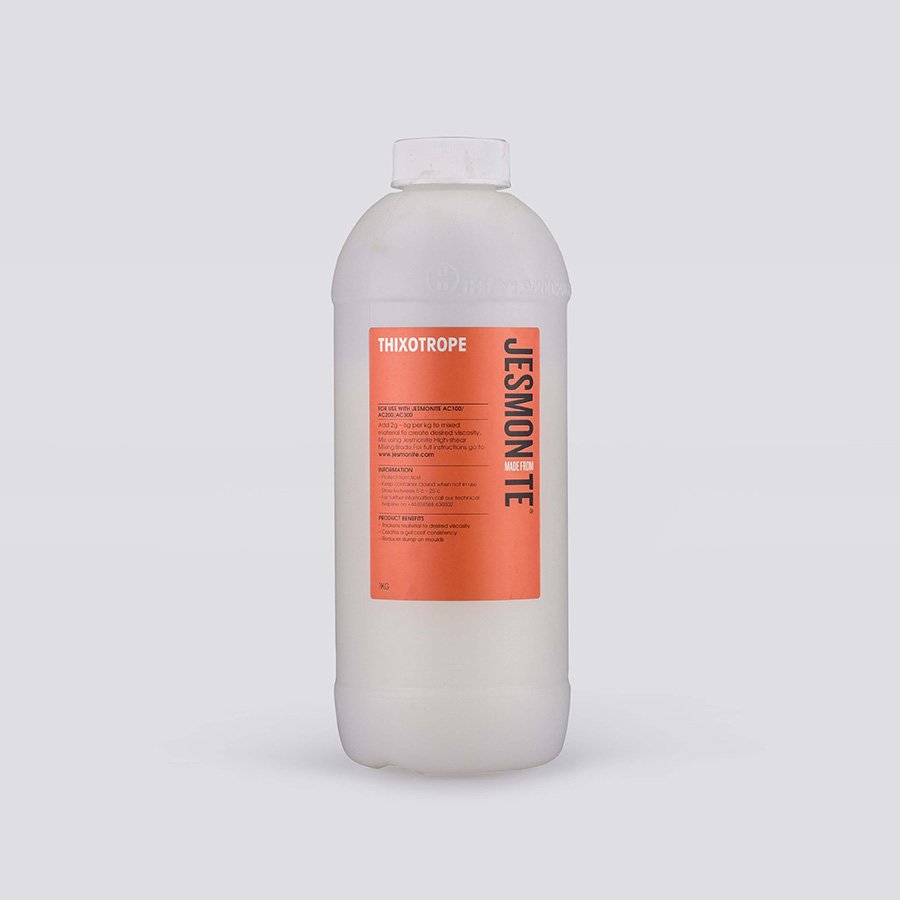 Thixotrope wordt aan het mengsel toegevoegd om het materiaal te verdikken tot een ‘Gel-Coat’ consistentie en zodat de viscositeit van Jesmonite kan worden aangepast aan de voorkeur van de gebruiker. Dit is handig bij het borstelen of spuiten van materialen op mallen met verticale vlakken, omdat het voorkomt dat het materiaal wegzakt.Door Thixotrope toe te voegen, is het mogelijk om een gecontroleerde materiaallaag van 1 - 3 mm aan te brengen zonder dat deze van het oppervlak van de matrijs afloopt. Dit voorkomt ook dat glasversterkingen zichtbaar worden aan het gezicht van gelamineerde objecten. Thixotrope kan ook worden gebruikt om van het materiaal een pasta te maken, die kan worden gebruikt als reparatievulmiddel en voegpasta voor het aan elkaar lijmen van twee laminatenThixotrope wordt toegevoegd aan het mengsel na de poeders en wordt gemengd met behulp van het High Shear-mengblad. Voeg druppel voor druppel toe totdat de gewenste consistentie is bereikt. Typische insluitingspercentages per gewicht zijn 2 g - 6 g per kilo mengselThixotrope is niet compatibel met AC730 of AC830