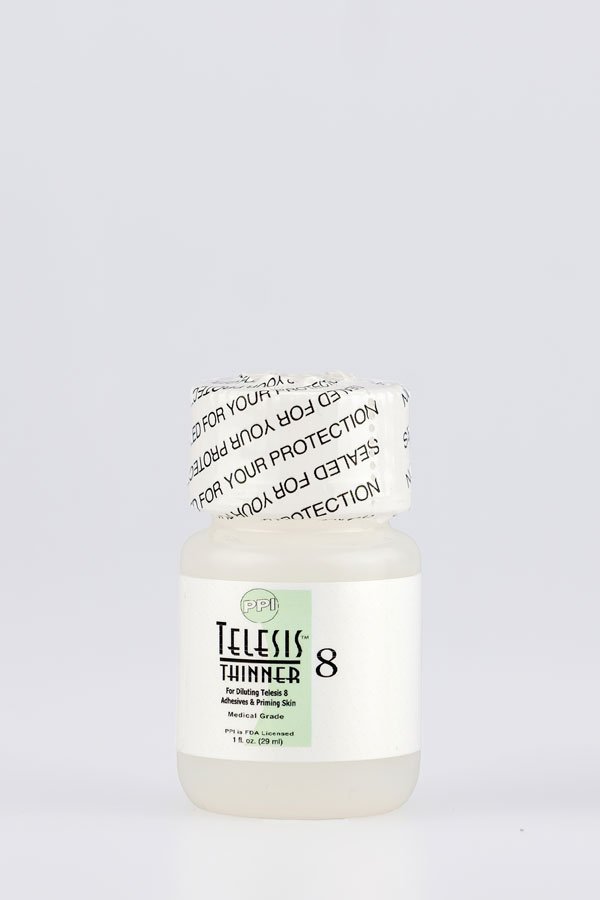 TELESIS 8 Thinner can be used to thin out Telesis 8 Silicone Adhesive when necessary, as well as prime the skin surface before application. To accelerate the drying time of Telesis 8, prime the skin with the Thinner and then apply Telesis 8 to the appliance. Once the two surfaces connect, the drying time will take only a few moments. The hold is incredibly strong but very easy to remove with Telesis Silicone Adhesive Remover. This product is not compatible with Telesis 5 or Telesis 7 silicone adhesives.