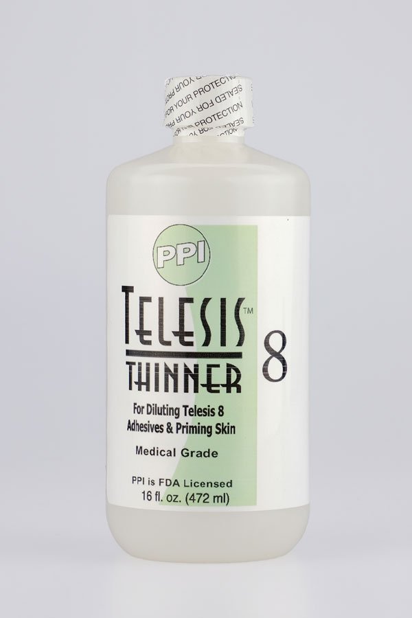 TELESIS 8 Thinner can be used to thin out Telesis 8 Silicone Adhesive when necessary, as well as prime the skin surface before application. To accelerate the drying time of Telesis 8, prime the skin with the Thinner and then apply Telesis 8 to the appliance. Once the two surfaces connect, the drying time will take only a few moments. The hold is incredibly strong but very easy to remove with Telesis Silicone Adhesive Remover. This product is not compatible with Telesis 5 or Telesis 7 silicone adhesives.