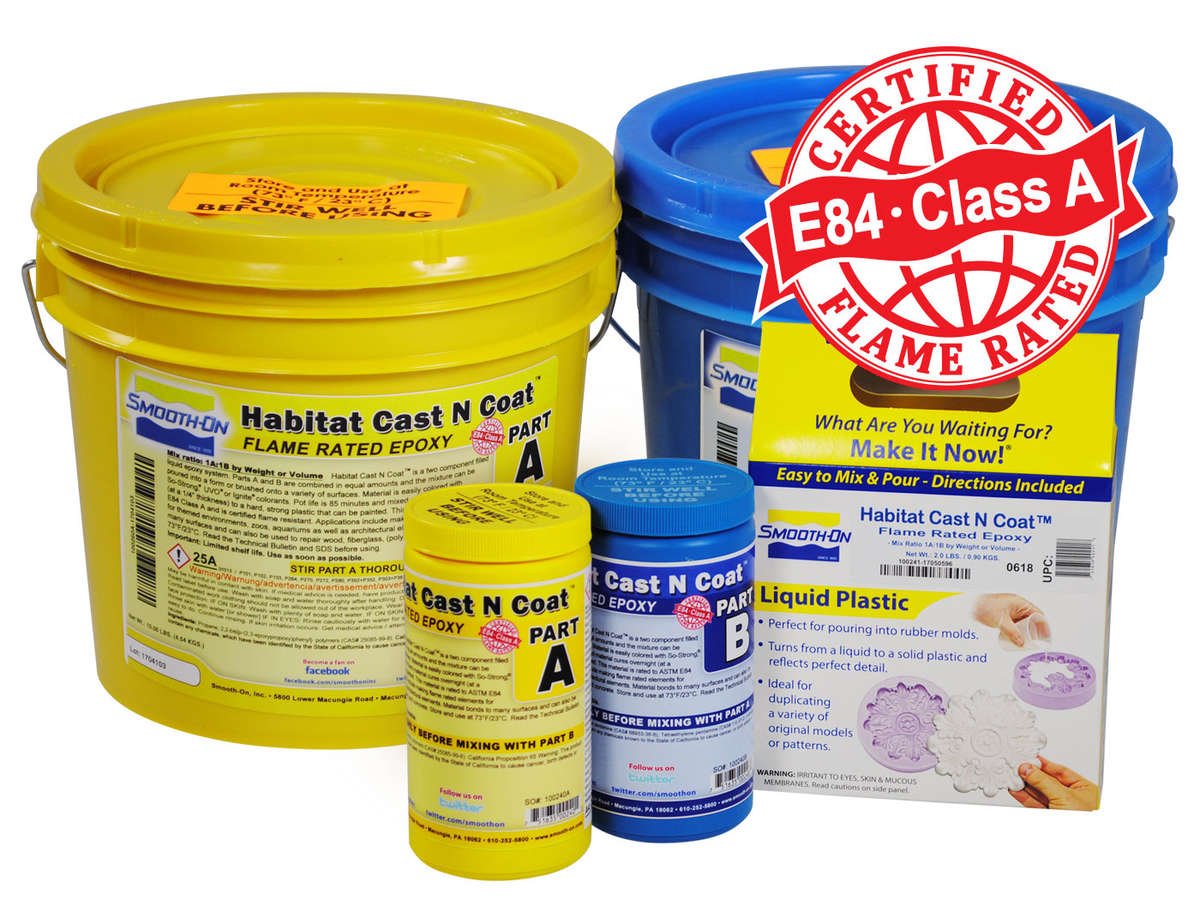 Habitat Cast N Coat ™ is een gevulde, twee componenten (A + B) vloeibare epoxy die solide of verdikt kan worden opgemeerd of gespateld op verticale oppervlakken. Het materiaal hardt uit tot een keiharde kunststof met verwaarloosbare krimp.Mengverhouding is 1A: 1B op volume. De werktijd is 85 minuten en het materiaal hardt na een nacht uit (bij kamertemperatuur). SO Strong®, UVO® of Ignite®-kleurstoffen kunnen tijdens het mengen aan de vloeibare Cast N Coat ™ worden toegevoegd om een ​​verscheidenheid aan kleureffecten te creëren. De uitgeharde epoxy kan worden geschuurd en geverfd met acrylverf.Habitat Cast N Coat ™ certificeert de hoogste beschikbare vlamklasse (ASTM E84, klasse A), waardoor dit materiaal ideaal is voor toepassingen in de openbare ruimte. Ook bevat het geen VOC's, ftalaten of kristallijne silica (een bekend carcinogeen) en is het veilig voor het maken van producten die gebruikt worden in de nabijheid van dieren / reptielen en in het water levende organismen.Epoxy hecht zich permanent aan zichzelf of aan verschillende oppervlakken en kan worden toegepast als een brandbestendige en beschermende / decoratieve coating op EPS of hardschuim, gipsplaat, hout, PVC en meer. Habitat Cast N Coat ™ is ook een uitstekend reparatiemateriaal en hecht permanent aan zichzelf, PVC, Plexiglas® (acryl), hout, vele metalen, kunststoffen en schuimen.