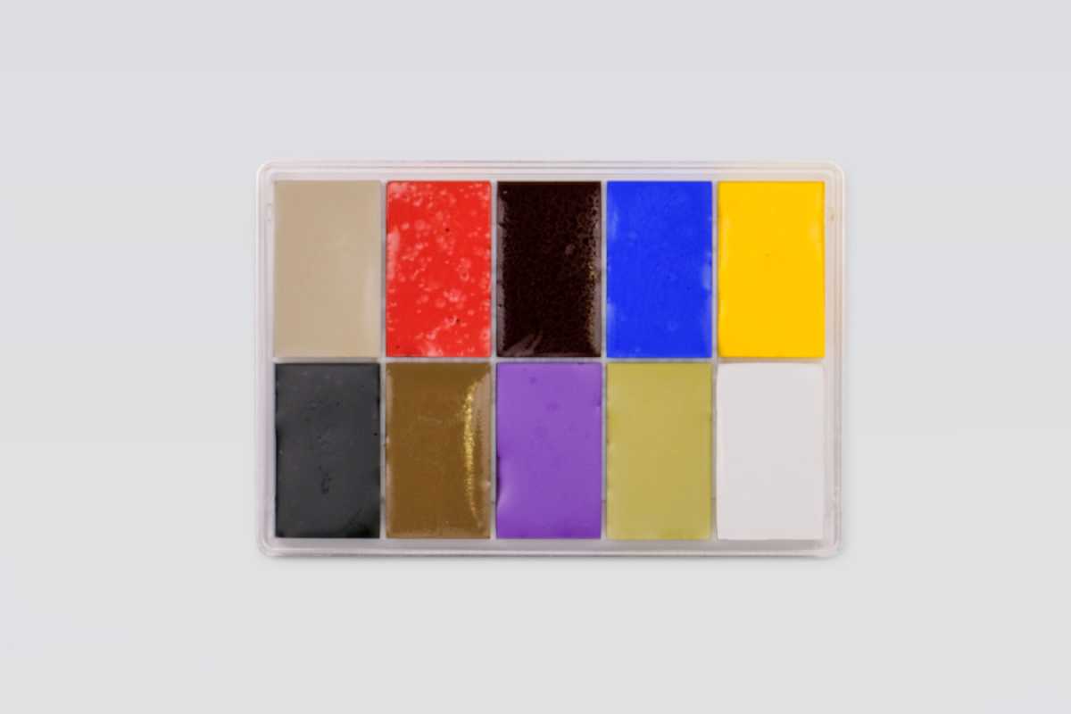 The MaqPro "FX" Slim palette; Contains 10 carefully selected colours from MaqPro in one palette. Made from MaqPro's traditional natural wax based formula called "Farde Créme".Highly pigmented color. The palette is the ultimate space-saver, giving you a wide range of Farde colours to carry. Contains the Farde Crémes:Jaune, Bleu, Rouge Sang, Rouge, Paleur, Blanc, Vert, Violet, Kaki and Noir(Yellow, Blue, Blood Red, Red, Pale, White, Green, Violet, Khaki and Black)15ml material