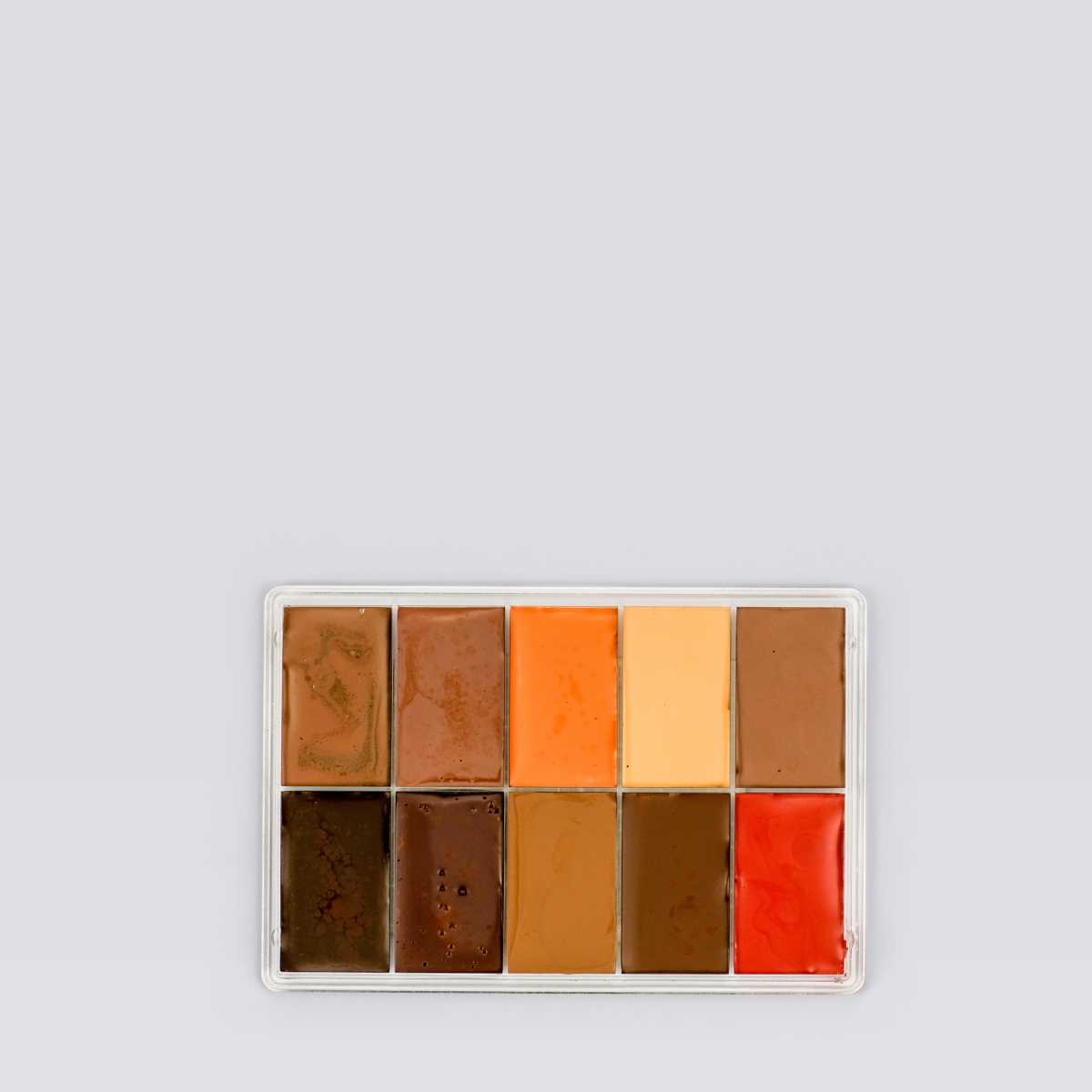 The MaqPro "FX" Slim palette; Contains 10 carefully selected colours from MaqPro in one palette. Made from MaqPro's traditional natural wax based formula called "Farde Créme".Highly pigmented color. The palette is the ultimate space-saver, giving you a wide range of Farde colours to carry. Contains the Farde Crémes:Jaune, Bleu, Rouge Sang, Rouge, Paleur, Blanc, Vert, Violet, Kaki and Noir(Yellow, Blue, Blood Red, Red, Pale, White, Green, Violet, Khaki and Black)15ml material