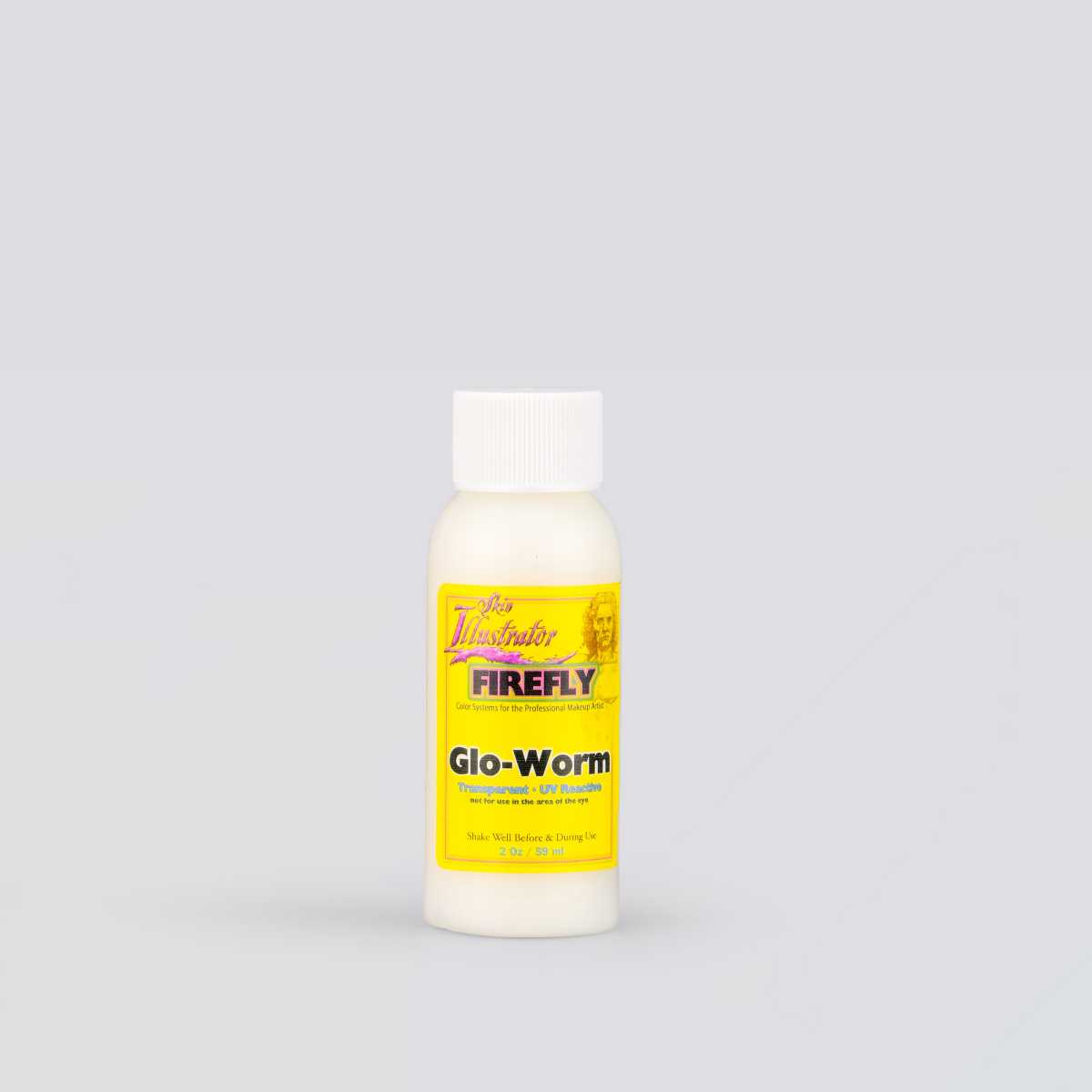 Glo-Worm is een nieuwe transparante UV-reactieve illustratorkleur die oplicht onder ultraviolet licht. Het kan over elke kleur van SKin Illustrator of elke kleur op waterbasis worden geverfd. Het is veilig voor gebruik op het gezicht. Perfect voor Halloween-achtervolgingen, avant-gardistische make-up en cosplay. FX-pigment voor onthullende effecten.