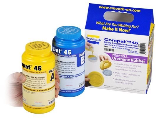 Compat 45 urethane is a unique urethane rubber which will not inhibit the cure of most Smooth-On platinum or tin cure silicone rubbers. It features a low viscosity for easy mixing and pouring and cures with minimal bubble entrapment. Mix ratio is 1A:1B by volume (85A:100B by weight), pot life is 25 minutes and the rubber cures with an ultimate Shore hardness of Shore 45A. Cured rubber is dimensionally stable (low shrinkage), offers good wear resistance and excellent library life. Compat 45 can be used for a variety of applications including making molds to cast silicone prop body parts, animatronic skins and medical trainers, as well as for making rubber masters which can be molded using platinum or tin silicone without inhibition concerns.Important; Do not use Ecoflex™ Gel, Ecoflex™ 00-10, Encapso-K, Rubber Glass™, Solaris™ or Sorta-Clear™ 12 or 37 with this product. They are not compatible and inhibition will result.