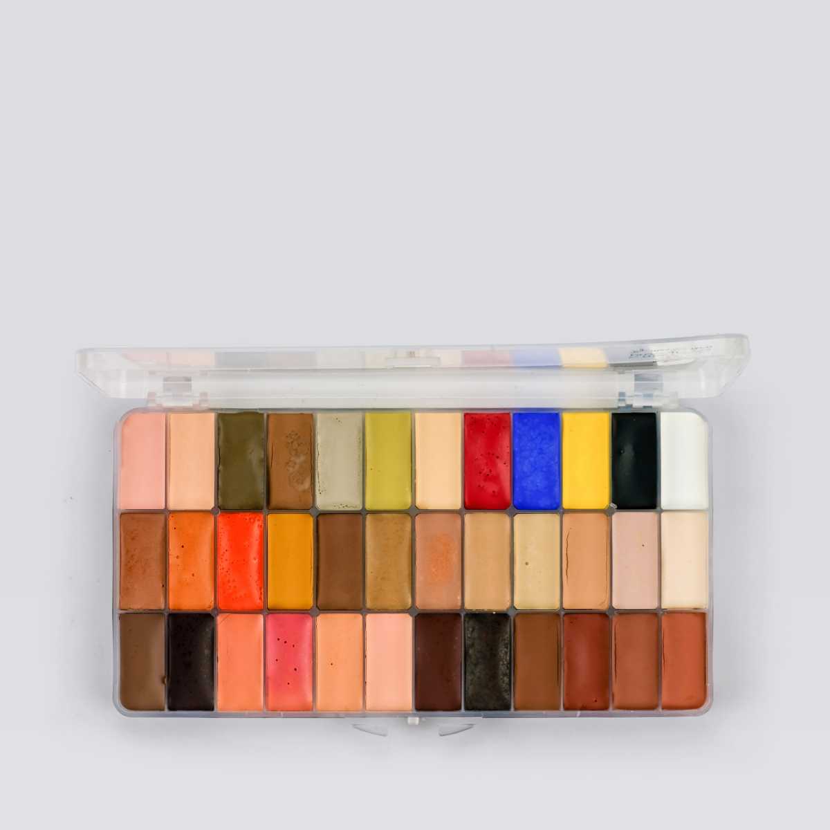 The unequalled MaqPro Grande 2 palette; Contains 36 carefully selected colours from MaqPro in one palette. Made from MaqPro's traditional natural wax based formula called "Farde Créme".Highly pigmented color. The palette is the ultimate space-saver, giving you a wide range of Farde colours to carry. Contains the Farde Crémes:1989, 51, CI, 29, 157, 155, 19, 151, 152, 145, 117, 128, TL1, TL2, TL3, 52, CR, 111, 141, 182, 181, 164, 170, 124, 91, 92, 10, 94, 41, 149, 61, 12, 12, V.2, V.3, V.4, V.5 252ml material