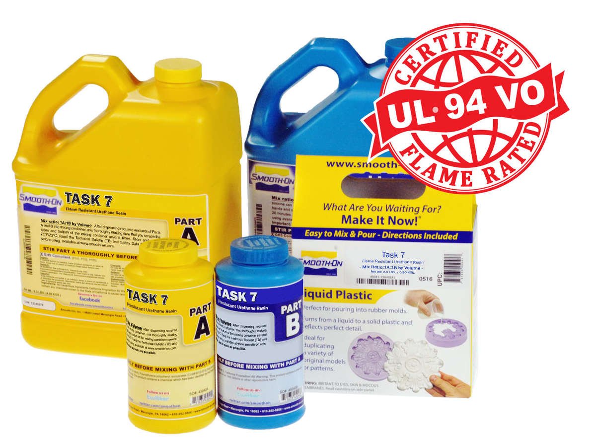 TASK® 7 is a low viscosity, fast set flame resistant plastic ideal for making fire resistant prototype and architectural models, model toys, theme park and stage elements, durable miniatures and special effect props. Flame Out® can also be used as a fire retardant potting and encapsulation compound.TASK® 7 meets UL 94 V-O requirements for flame resistance.Fully cured TASK® 7 material is tough, durable, machinable and paintable. It has much higher physical and performance properties than any other flame rated urethane available anywhere. Vibrant colors and color effects are possible by adding SO-Strong® color tints.Dispense equal amounts 1A:1B by volume. Dispense Parts A & B into mixing container. Mix Parts A & B as directed. Pour into mold. TASK® 7 cures in minutes. Casting can be demolded after 10 minutes. TASK® 7 reflects perfect detail and will self-extinguish.