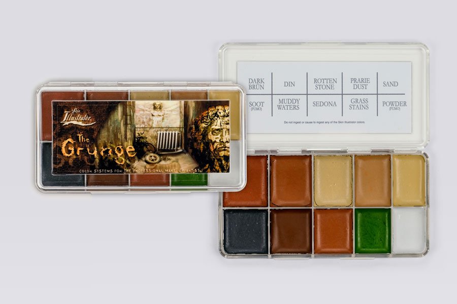 Skin Illustrator Grunge Palette - This collection of colors is designed to simulate a variety of dirt, grime, and filth effects, and can be used to recreate the look of almost any dirty or soiled visage. "The Grunge" palette unites Skin Illustrator colors that have been used separately for years. The colors have been created in collaboration with top artisans in the industry, and have been refined on various actors for the camera. Two of the colors, Soot and Powder, have been introduced with the tag "fumo," meaning, "smoke." They are designed to have a serendipitous smoke quality that can be built up into overlapping patterns. Laying down layers of Soot followed by streaks of Black from the "FX" palette will introduce layering effects that add more depth than using either color alone. You must use Skin Illustrator Activator or 99% alcohol to activate the color pigment. Do Not use 70% alcohol, MEK, acetone, water or any other solvent.