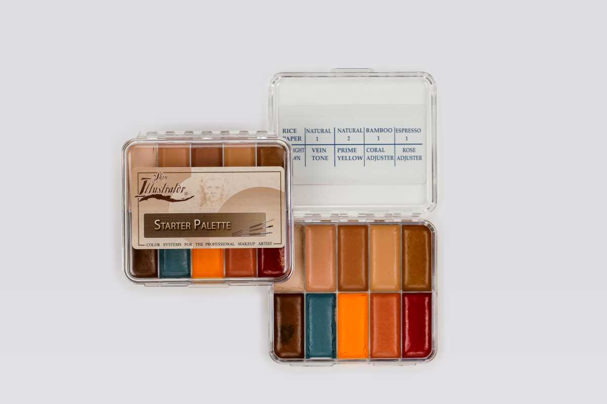 Skin Illustrator Grunge Palette - This collection of colors is designed to simulate a variety of dirt, grime, and filth effects, and can be used to recreate the look of almost any dirty or soiled visage. "The Grunge" palette unites Skin Illustrator colors that have been used separately for years. The colors have been created in collaboration with top artisans in the industry, and have been refined on various actors for the camera. Two of the colors, Soot and Powder, have been introduced with the tag "fumo," meaning, "smoke." They are designed to have a serendipitous smoke quality that can be built up into overlapping patterns. Laying down layers of Soot followed by streaks of Black from the "FX" palette will introduce layering effects that add more depth than using either color alone. You must use Skin Illustrator Activator or 99% alcohol to activate the color pigment. Do Not use 70% alcohol, MEK, acetone, water or any other solvent.