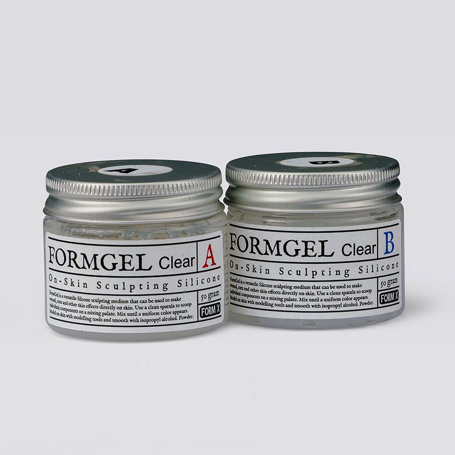 FormGel Clear /50 gram - FormGel is een unieke tweecomponenten siliconen voor make-up effecten op de huid. Het is een dikke pasta die gemakkelijk op de huid kan worden gemengd en gemodelleerd. Het is translucent en kan gemakkelijk met (silicone) pigmenten intrensiek (van binnen uit) worden gekleurd. Verschillende soorten make-up kunnen worden gebruikt om de gedroogde FormGel met na te kleuren. 25 gram een component en 25 gram b component.