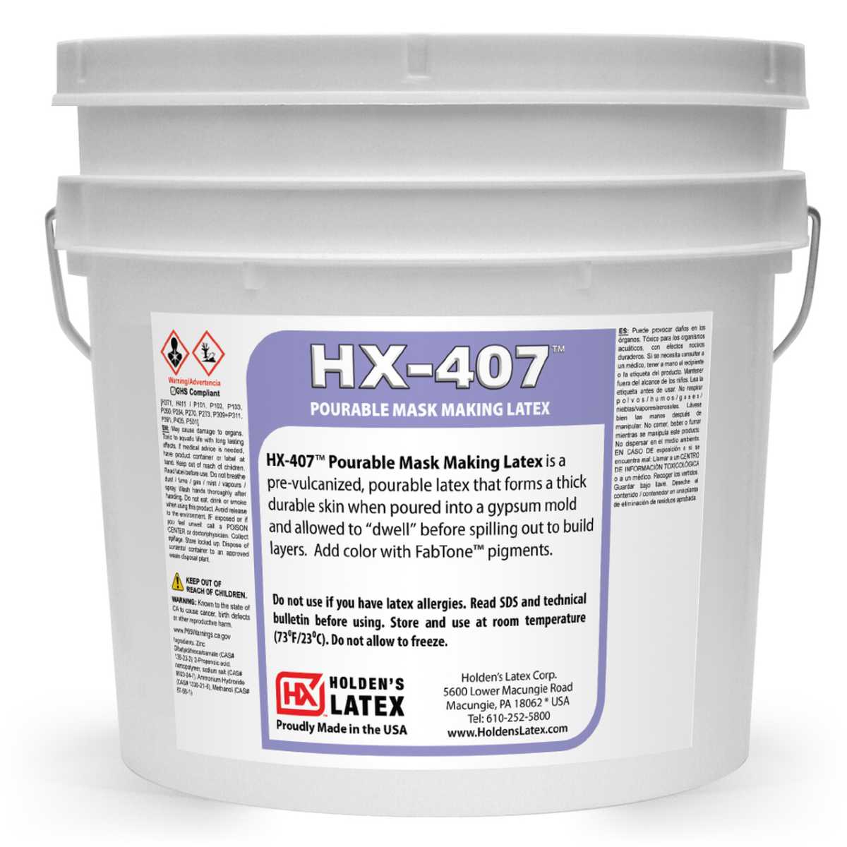 HX-407™ Mask Making Latex is een gietbare voorgevulkaniseerde, latex die een dikke, duurzame huid vormt wanneer deze in een gipsen mal wordt gegoten voordat het er na een tijd uit wordt gehaalt om lagen te bouwen. Voeg kleur toe met FabTone™ kleurstof.