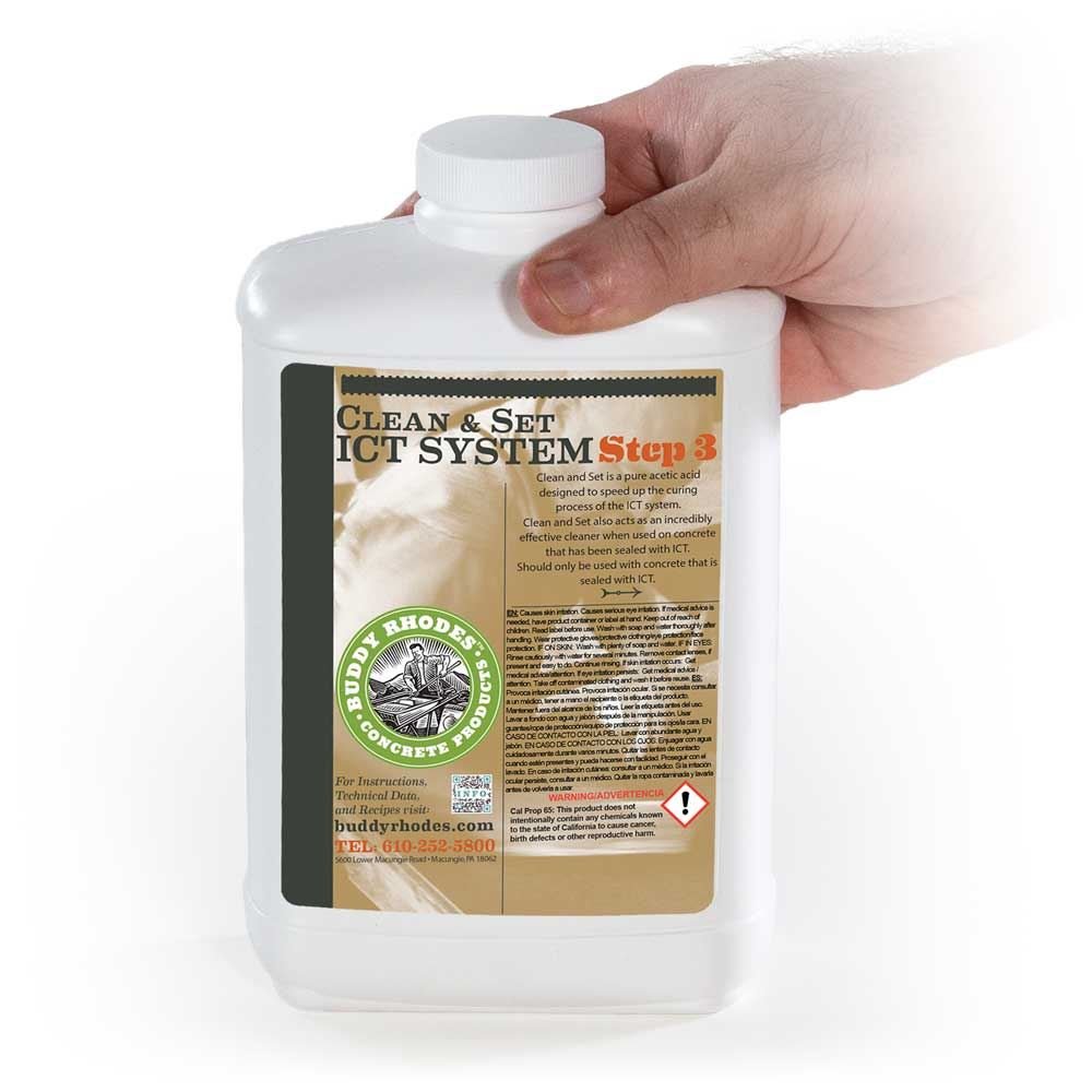 Clean & Set is de derde en laatste stap van het ICT sealsysteem. Het versnelt de uitharding van de FS Seals sealer. Bovendien is het een effectieve manier om de met ICT behandelde oppervlakken te reinigen. Clean & Set is gebaseerd op azijnzuur en moet worden gemengd met drie delen water.