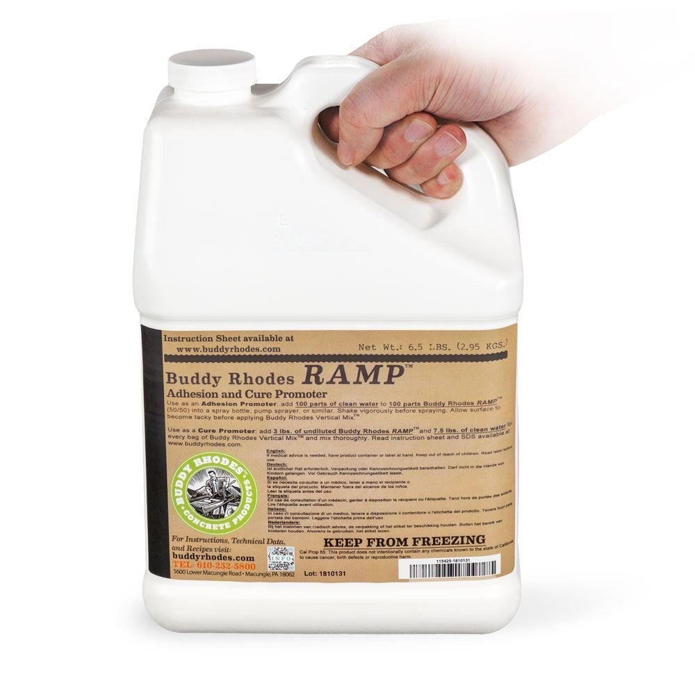 RAMP™ is een vloeibare polymeeradhesie- en uithardingspromotor, speciaal ontwikkeld voor gebruik met het Buddy Rhodes Vertical Mix™ beton. Het toevoegen van RAMP™ zorgt voor een goede uitharding van Verticale Mix™ en verbetert de algehele fysieke eigenschappen. Het vermindert ook de opname van water en zout en verbetert de weerstand tegen bevriezen/ontdooien aanzienlijk.Bereiding - Dit product is beperkt houdbaar en moet zo snel mogelijk worden gebruikt. BEHOUD VAN BEVRIEZING. Bewaren en gebruiken bij kamertemperatuur 23° C. Draag lange mouwen en vinyl wegwerphandschoenen in een goed geventileerde ruimte wanneer u dit product gebruikt.Gebruik als hechtingsbevorderaar - Breng een grondlaag van RAMP™ aan voordat u Buddy Rhodes Vertical Mix™ beton mengt en aanbrengt. Meng 100 delen RAMP™ met 100 delen water (50/50). Aanbrengen op alle oppervlakken met een spuitfles, pompverstuiver of iets dergelijks. Laat het plakkerig worden voordat u Verticale Mix™ aanbrengt. Als de primer volledig droog is, breng dan opnieuw aan en wacht tot hij kleverig is voordat u verder gaat.