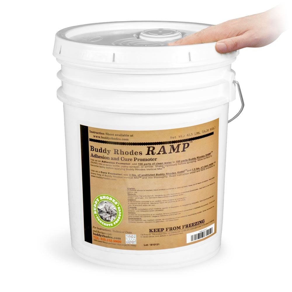 RAMP™ is een vloeibare polymeeradhesie- en uithardingspromotor, speciaal ontwikkeld voor gebruik met het Buddy Rhodes Vertical Mix™ beton. Het toevoegen van RAMP™ zorgt voor een goede uitharding van Verticale Mix™ en verbetert de algehele fysieke eigenschappen. Het vermindert ook de opname van water en zout en verbetert de weerstand tegen bevriezen/ontdooien aanzienlijk.Bereiding - Dit product is beperkt houdbaar en moet zo snel mogelijk worden gebruikt. BEHOUD VAN BEVRIEZING. Bewaren en gebruiken bij kamertemperatuur 23° C. Draag lange mouwen en vinyl wegwerphandschoenen in een goed geventileerde ruimte wanneer u dit product gebruikt.Gebruik als hechtingsbevorderaar - Breng een grondlaag van RAMP™ aan voordat u Buddy Rhodes Vertical Mix™ beton mengt en aanbrengt. Meng 100 delen RAMP™ met 100 delen water (50/50). Aanbrengen op alle oppervlakken met een spuitfles, pompverstuiver of iets dergelijks. Laat het plakkerig worden voordat u Verticale Mix™ aanbrengt. Als de primer volledig droog is, breng dan opnieuw aan en wacht tot hij kleverig is voordat u verder gaat.