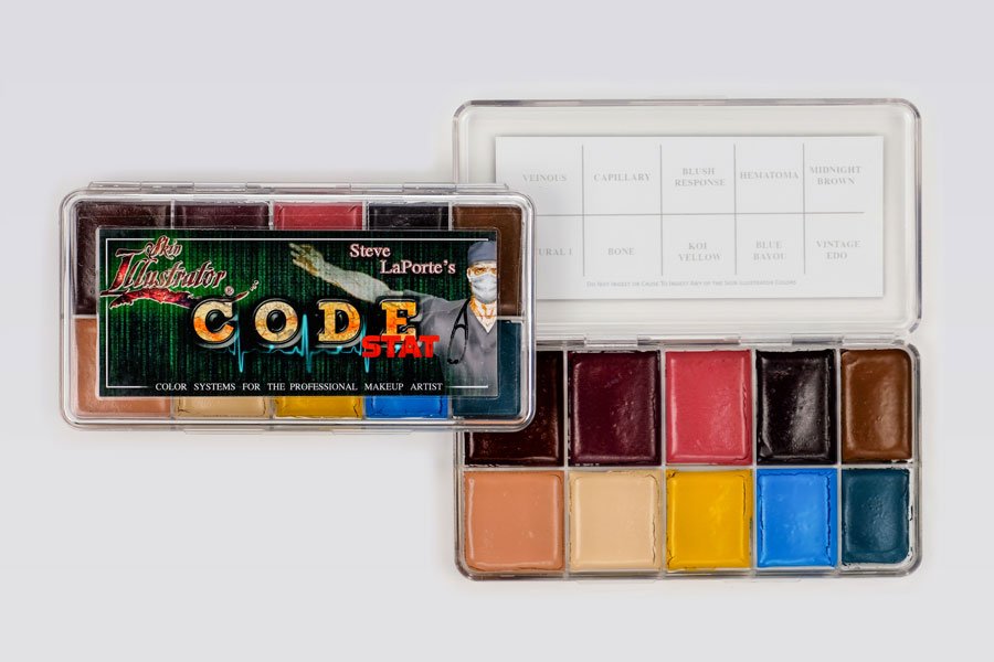 The Skin Illustrator Code Stat Palette was custom created exclusively for Oscar Award winning makeup artist, Steve LaPorte, for use on the CBS hospital drama, Code Black. As makeup Department head for the series entirety, Steve chose this selection of ten Skin Illustrator colors as the best combination to meet his needs, while creating all makeups possible in a hospital setting. Included in this palette are two custom colors, made by Steve, especially for use on this show.