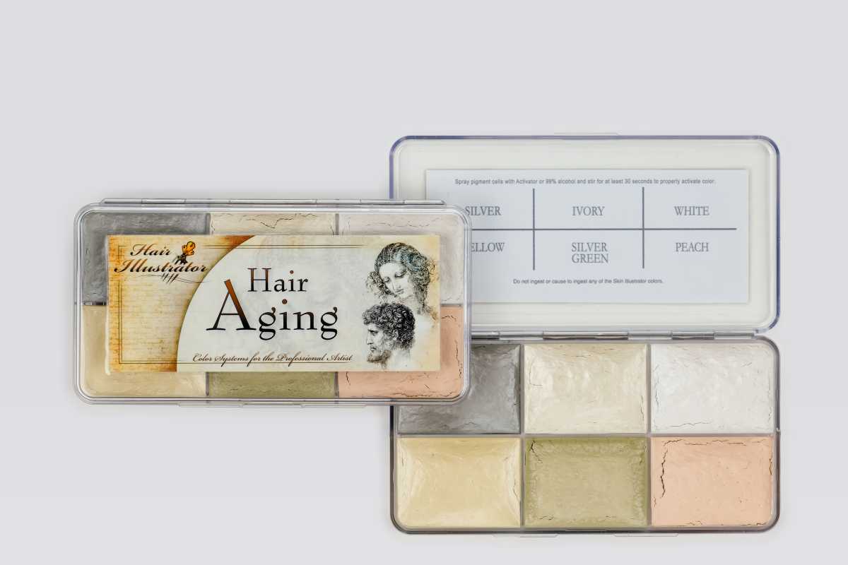 Age any colour of hair easily. From a few years to a few decades with the Hair Aging Palette. Includes the colours: Silver, Ivory, White, Yellow, Silver, Green