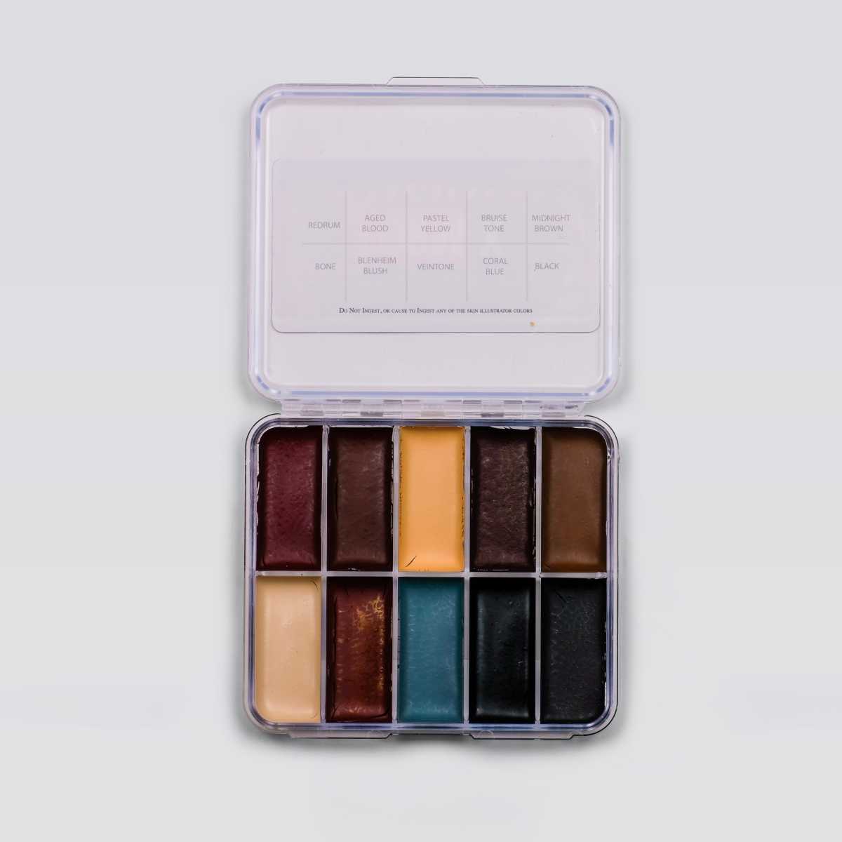 The Skin Illustrator FormX Detailer was custom designed for maximum usability. Paired with the FormX Basics Paletteits the perfect set for almost any make-up challenge; wether it's old age prosthetics or out-of-the-kit effects.Colors included are:Redrum, Aged Blood, Pastel Yellow, Bruise Tone, Midnight BrownBone, Blenheim Blush, Veintone, Coral Blue, BlackThe colors can easily be applied with a brush, sponge or mascara wand. Use it alone, or mix the colors with any of the other Skin Illustrator tones to create your own unique blend of color.You must use Skin Illustrator Activator, Skin Illustrator Slow Activator, or 99% alcohol to activate the color pigment. Do not use 70% alcohol, MEK, acetone, water or any other solvent. Removal is easy with PPI’s Telesis Beta Solv or Telesis Super Solv.