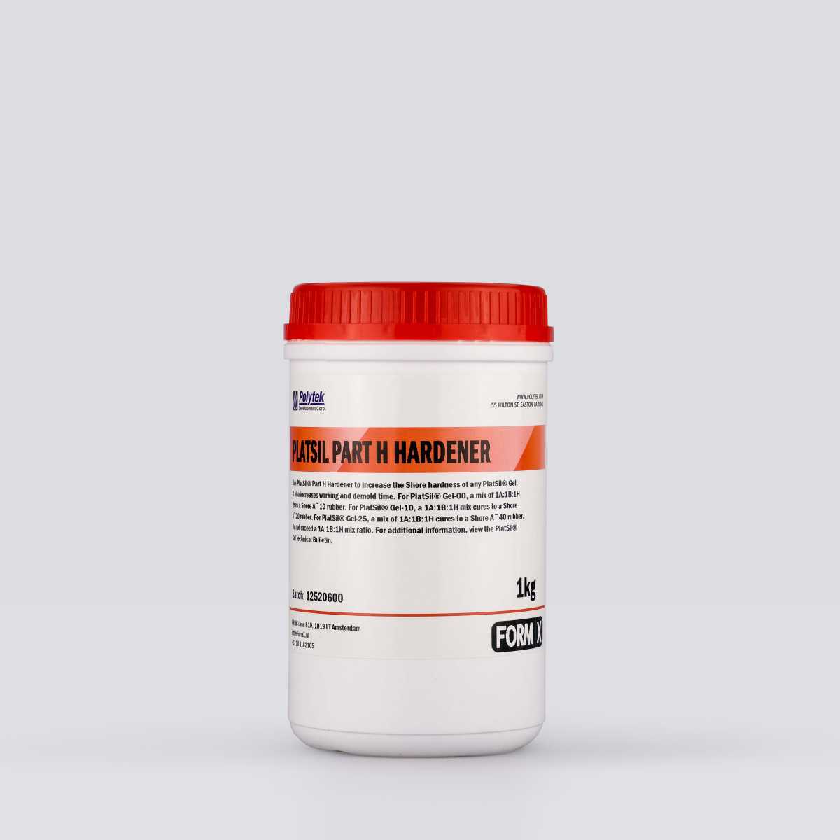 Gebruik PlatSil® deel H Verharder om de Shore-hardheid van elke PlatSil® Gel te verhogen. Het verhoogt ook de werk- en ontvormtijd. Voor PlatSil® Gel-00 geeft een mengsel van 1A:1B:1H een Shore A~10 rubber. Voor PlatSil® Gel-10 hardt een 1A:1B:1H mengsel uit tot een Shore A~20 rubber. Voor PlatSil® Gel-25 hardt een mengsel van 1A:1B:1H uit tot een Shore A~40 rubber. Overschrijd een mengverhouding van 1A:1B:1H niet. Bekijk voor meer informatie het PlatSil® Gel Technisch Bulletin.ALLEEN VOOR INDUSTRIEEL/PROFESSIONEEL GEBRUIK.