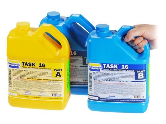 TASK™16 is a low odor, fast-setting Shore 80A/30D urethane that offers very high tear strength, impact resistance and wear resistance. TASK™16 is phthalate free, mercury free and MOCA free. Mixed one part A to two parts B by weight, TASK™16 pours easily. Working time is 6 minutes and handling time is 90 minutes at room temperature. Cured rubber has exceptional performance characteristics and dimensional stability. TASK™16 can be colored with SO‑Strong™ or Ignite™ colorants.TASK™16 is suitable for making fast mechanical parts, gaskets, wheels and pullies, impact resistant props, and archival master models. It is also used to make fast, wear resistant rubber molds for casting concrete or concrete stamping pads. TASK™16 is also an excellent choice for rotocasting to create hollow semi-rigid castings.IMPORTANT: Cured TASK™16 will inhibit the cure of liquid platinum silicone. You can not pour platinum silicone into cured TASK™16. Tin silicone must be used if you intend to pour silicone against cured TASK™16