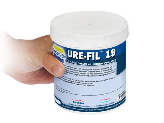 URE-FIL™ 17 pure aluminum pellet fillers can be used with Smooth-On® liquid epoxy and urethane resins to improve thermal conductivity, dimensional stability, reduce shrinkage in large mass castings, etc. These fillers can also be used to add evenly distributed weight to metal cold-castings and to create artistic casting effects.URE-FIL™ 17 are small grain aluminum pellets 400 micron. Smaller grain pellets will settle into areas of detail better, reducing voids between particles. FEATURES- Can be added to aluminum-filled urethane and epoxy resins for vacuum forming applications to increase thermal conductivity (even heat distribution) when casting parts for applications with higher temperature requirements.- Will add evenly distributed weight to metal cold-castings to simulate the feel of solid metal reproductions at a reduced expense compared to metal foundry castings.- Will lower exothermic (heat) temperatures during cure cycle (see chart on reverse side), which reduces the shrinkage rate resulting in improved dimensional stability in large mass castings.- Can be added to liquid urethane and epoxy resins to create metallic visual effects when used with clear and colored liquid plastics.- When fully cured, resin filled with URE-FIL™ 17 & 19 can be cut, drilled, turned and machine tooled.- Should not be used as fillers in RTV rubber products.