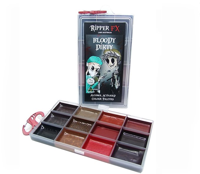 Ripper Fx Bloody Dirty Alcohol PaletteAn alcohol based high definition colour palette. These dry palettes are activated with 99% isopropyl alcohol. They can be used to create strong opaque or sheer washes of colour. They are suitable for use on skin, foam latex, geletine and silicone. The result is a colour that looks like it is part of the skin, not makeup.Designed to last throughout the whole day. Fully waterproof and sweat resistant. Minimal touch up required.A variety of colour palette combinations available for a variety of jobs. Palette refill colours are also available for when your favourite shades run out.All products designed and manufactured by Ripper Fx Labs Australia, researched and developed by a fully qualified cosmetics chemist with FDA approved pigments and full MSDS safety documents.Cruelty free and VeganInstructions: Activate with 99% Isopropyl alcohol.Do not use with 70% alcohol.Palette Dimensions: 18cm x 10cm x 2cmProduct Specifications:Size:12 Colours
