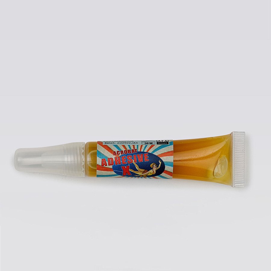 Adhesive X is voor wie het wat dikker wil, en het heeft ook een sterkere hold. Geweldig voor gezichtshaar en ook in de hitte en water.Verf op, laat het een beetje drogen, zodra het begint te drogen TACK, plaats dan de veter naar beneden. De lijm droogt ZEER MATTE op.*10ml
