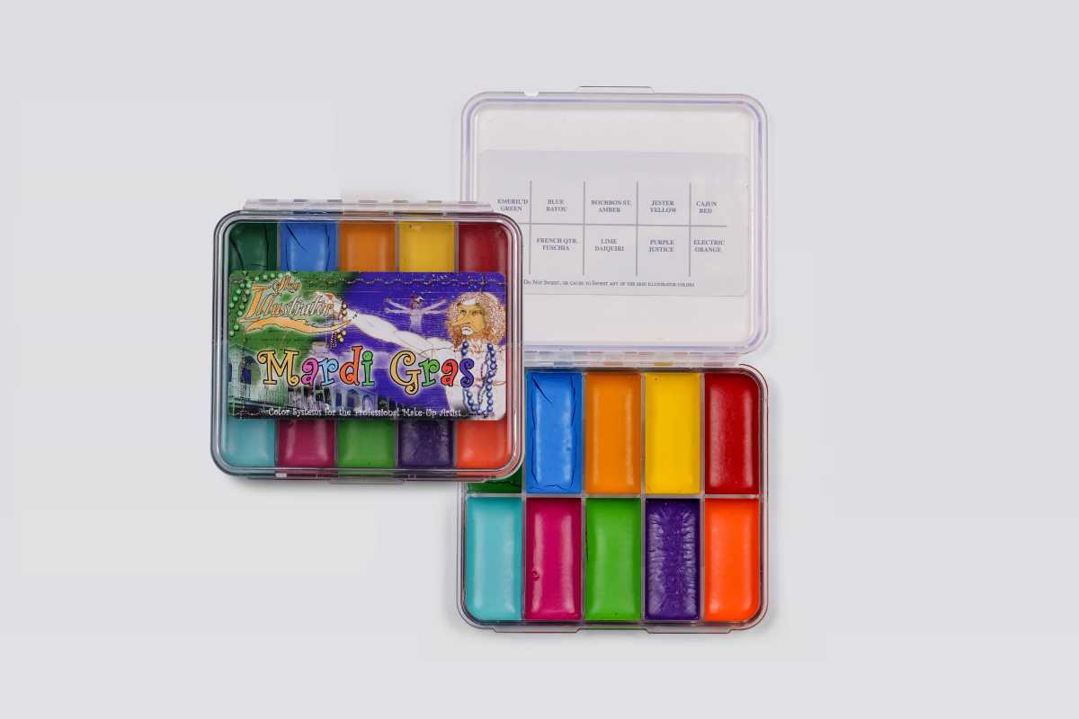 This unique collection of colorful pigments was designed for creating clowns, mimes, tattoos, and the psychedelic 60's and 70's. The bright exotic colors are perfect for carnival and festival body and face painting. The Mardi Gras Palette can be used with any other Skin Illustrator palette to create your own new colors and shades. Colours include: Emeril'd Green, Blue Bayou, Boubon St. Amber, Jester Yellow, Cojun Red, Mint Julep, French Qtr. Fuschia, Lime Daiquiri, Purple Justice, Electric Orange.