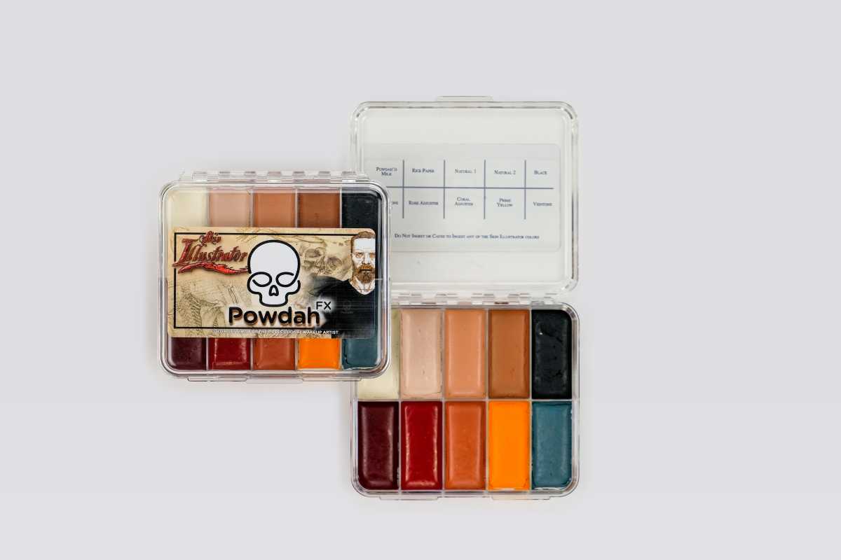 Ik wilde een palet met al mijn go-to-kleuren voor het maken van realistische wonden en moulage. Het is ontworpen met de beginnende visagist/grimeur in gedachten. De bovenste rij kleuren is gekozen om de huid te simuleren. Deze kunnen met elkaar worden gemengd om nieuwe huidtinten te creëren. Er is ook een aangepast gebroken wit dat ik al jaren wilde hebben, met de toepasselijke naam Powdah'd Milk. De onderste rij bevat alle kleuren die ik gebruik om de binnenkant van wonden te detailleren en afwerkingdetails toe te voegen.- Powdah (Marc Clancy)Dit palet is gemaakt voor autodidactische make-upartiest voor speciale effecten, Powdah (Marc Clancy).Kleuren die het bevat zijn Powdah'd Milk, Rice Paper, Natural 1, Natural 2, Black, Blood Tone, Rose Adjuster, Coral Adjuster, Prime Yellow en Vein Tone.U moet Skin Illustrator Activator of 99% alcohol gebruiken om het kleurpigment te activeren. Gebruik geen 70% alcohol, MEK, aceton, water of enig ander oplosmiddel.Verwijderen is gemakkelijk met Telesis Beta Solv, Telesis Super Solv of Telesis Makeup Remover.