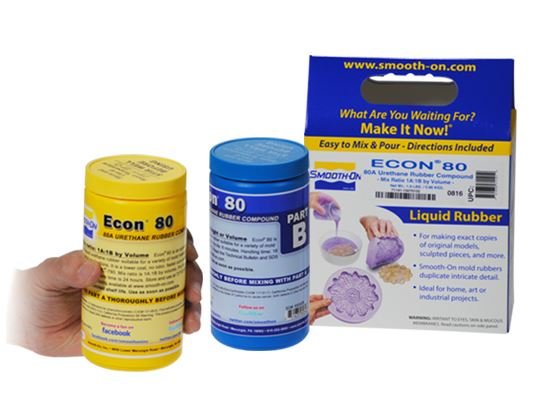 Econ® 80 is een economische Shore 80A polyurethaanrubber geschikt voor een verscheidenheid aan afvormen en industriële toepassingen. Het is een goedkoper, sneller dan de populaire PMC®-780. Fysische eigenschappen zijn minder vergeleken met de PMC®-780.Dit is een geurloos systeem met een mengverhouding van 1A: 1B heeft en een lage viscositeit voor makkelijk mengen en gieten. De werktijd bedraagt ongeveer 13 minuten bij kamertemperatuur, de verwerkingstijd bedraagt 6 uur en de rubber hardt over nacht met minimale krimp. Econ® 80 is doorschijnend en gemakkelijk te kleuren met SO-Strong® of Ignite® kleurstoffen.Econ® 80 wordt gebruikt om korte-termijnvormen te maken voor beton en harsen, betonnen stempelkussens, rubberen mechanische onderdelen, bekledingsstoffen, gietstukken voor industriële uitrusting en begraafplaatsen.