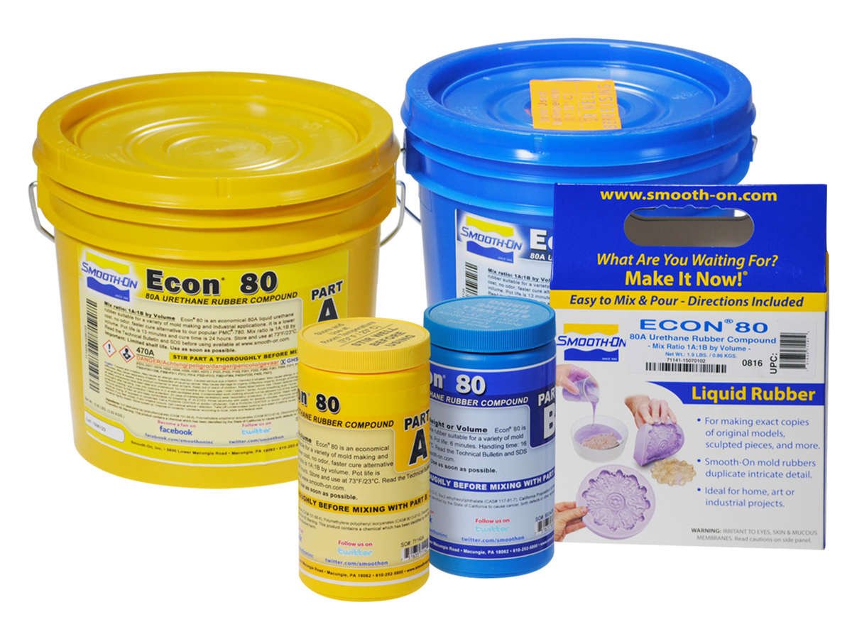 Econ® 80 is een economische Shore 80A polyurethaanrubber geschikt voor een verscheidenheid aan afvormen en industriële toepassingen. Het is een goedkoper, sneller dan de populaire PMC®-780. Fysische eigenschappen zijn minder vergeleken met de PMC®-780.Dit is een geurloos systeem met een mengverhouding van 1A: 1B heeft en een lage viscositeit voor makkelijk mengen en gieten. De werktijd bedraagt ongeveer 13 minuten bij kamertemperatuur, de verwerkingstijd bedraagt 6 uur en de rubber hardt over nacht met minimale krimp. Econ® 80 is doorschijnend en gemakkelijk te kleuren met SO-Strong® of Ignite® kleurstoffen.Econ® 80 wordt gebruikt om korte-termijnvormen te maken voor beton en harsen, betonnen stempelkussens, rubberen mechanische onderdelen, bekledingsstoffen, gietstukken voor industriële uitrusting en begraafplaatsen.