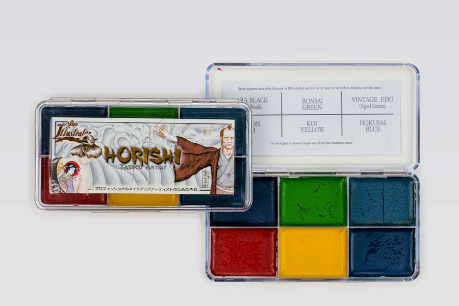 The Skin Illustrator Horishi palette is created to make any kind of tattoo; form vintage sailors tattoo's to trendy tribals and anything in between. Designed specifically to create traditional Japanese tattoos, this palette is a must-have addition to your kit.