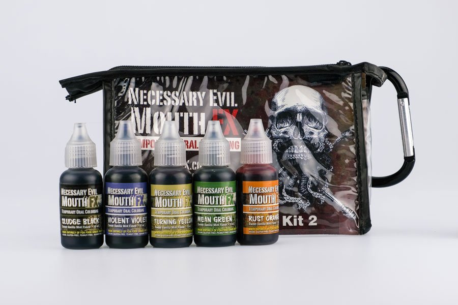 Mouth FX is een tijdelijk oraal kleursysteem dat is ontworpen om de binnenkant van de mond veilig en effectief te kleuren. Mouth FX bevat een zoete vanillemuntsmaak die volledig is gemaakt van FDA-ingrediënten voor levensmiddelen en elke kleur is veganistisch, glutenvrij, pinda-vrij, suikervrij en wreedheidvrij. Mouth FX wordt geleverd in vijf verschillende kleuren - afzonderlijk verkrijgbaar of samen in één set (inclusief draagtas en karabijnhaakclip). Mouth FX is gemaakt door Dan Gilbert en Necessary Evil FX.MouthFX Kit 2 bevat: - Roestoranje, Slibzwart, Geel aan het draaien, Violent Violet en Mean Green