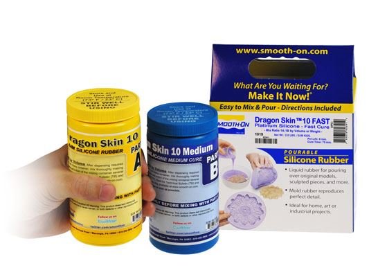Dragon Skin™ siliconen zijn hoogwaardige platina-uithardende vloeibare siliconen die worden gebruikt voor een verscheidenheid aan toepassingen, van het creëren van skin-effecten en andere SFX effecten tot het maken van productiemallen voor het gieten van een verscheidenheid aan materialen. Vanwege de fysieke eigenschappen en flexibiliteit van Dragon Skin™ siliconen worden ze ook gebruikt voor medische protheses en dempingstoepassingen. Dragon Skin™ wordt ook gebruikt voor een verscheidenheid aan industriële toepassingen en heeft een gebruikstemperatuurbereik van een constante (-53°C tot +232°C).Dragon Skin™ 10 Medium - Werktijd 20 minuten - Uithardingstijd 5 uur - Shore A10Geweldig voor het maken van mallen voor een verscheidenheid aan toepassingen — Dragon Skin™ siliconen kunnen worden gebruikt om uitzonderlijk sterke en scheurbestendige mallen te maken voor het gieten van gips, was, beton, harsen en andere materialen.Beproefd, veelzijdig materiaal voor speciale effecten - Zacht, supersterk en rekbaar, Dragon Skin™ wordt over de hele wereld gebruikt om spectaculaire huid- en wezeneffecten te maken. Een oneindig aantal kleureffecten kan worden bereikt door Silc Pig™ siliconenpigmenten of Cast Magic™ effectpoeders toe te voegen. Uitgehard rubber kan ook worden geverfd met Psycho Paint™.Eenvoudig te gebruiken — Dragon Skin™ siliconen worden 1A:1B gemengd op basis van gewicht of volume. Vloeibaar rubber kan worden verdund met Silicone Thinner™ of verdikt met THI-VEX™. Rubber hardt uit bij kamertemperatuur 23°C met verwaarloosbare krimp. Vacuüm ontluchting wordt aanbevolen om luchtbellen in uitgehard rubber tot een minimum te beperken.Dragon Skin™ 10 siliconen zijn vlamgekeurd volgens de UL-94 HB-specificatie en ze voldoen aan de B1-classificatie voor de GB 8624-2012 brandtest voor bouwmaterialen en producten (exclusief 'NV'-formules). Gecertificeerde huidveilig - Uitgehard Dragon Skin™ is huidveilig en is gecertificeerd door een onafhankelijk laboratorium. OESO TG 439-certificering. Bij het testen werden geen dieren gebruikt.