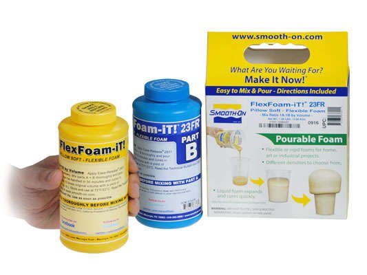 FlexFoam-iT!™ Series foams are premium quality water blown flexible foams that can be used for a variety of industrial, special effects and art & crafts and projects. With several to choose from, uses include making theatrical props (swords, knives, hammers, etc.), industrial gaskets, custom padding and cushioning, and more. SO-Strong™ colorants can be added for color effects. Part A and B liquids are combined, mixed and poured into a mold or other form (apply release agent if necessary). Mixture will rise and cure quickly to a solid, flexible foam. Foams vary by density and offer good physical properties. FeaturesFlexFoam-iT!™ 23 FR is flame rated to UL-94 HB specification