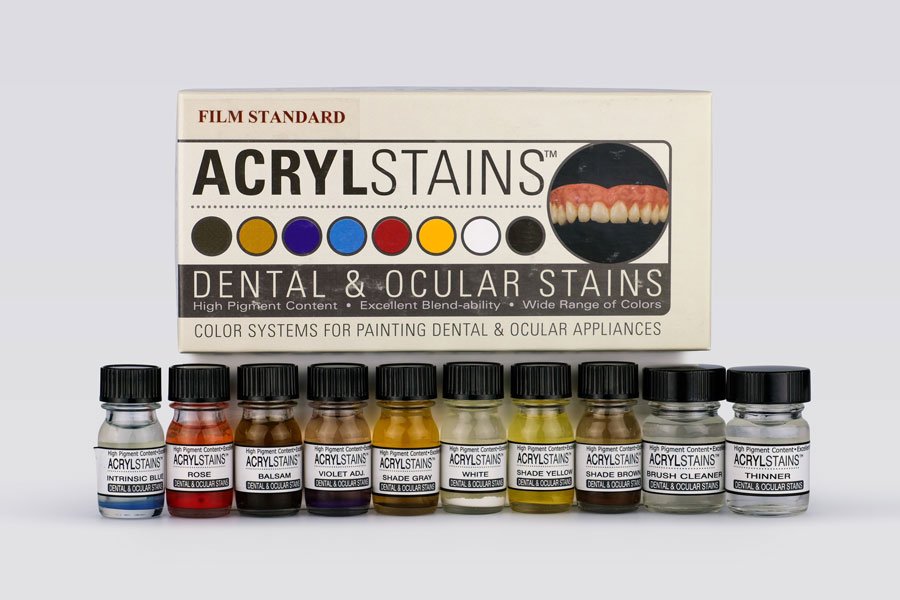 AcrylStains is an innovative new color system for permanent dental and ocular appliance staining. Available in two different color kits, Character and Film Standard, the secret of AcrylStains is the high pigment content and wide range of usable colors. The Character kit contains: Shade Brown, Zombie Green, Nicotine, clot, Bloody, Pumkin, Multi-Glaze and Black. The kit also contains a thinner and a brush cleaner. The wide range of colors make blending easier and more natural, and its durability lasts longer than any similar product.