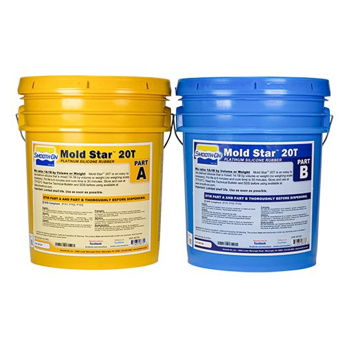 Mold Star™ 20T is an easy to use Shore 20A translucent platinum silicone that is mixed 1A:1B by volume (no weighing scale necessary). It features a relatively low viscosity and vacuum degassing is not required for most applications. Pot life is 6 minutes and cure time is 30 minutes at room temperature.FeaturesMold Star™ 20T cures in to a soft, strong rubber that is tear resistant and exhibits very low long term shrinkage. Molds made with Mold Star™ will last a long time in your mold library and are good for casting wax, gypsum, resins, and other materials. An infinite number of color effects can be achieved by adding Silc Pig™ silicone pigments or Cast Magic™ effects powders.Mold Star™ 20T is heat resistant up to 232°C and is suitable for casting low-temperature melt metal alloys.Cured Mold Star™ 19T, 20T and 31T silicones have been tested and certified skin safe by an independent laboratory.Note: This product will not cure against surfaces containing sulfur, even when sealed. Mix Ratio By Weight & Volume 1A:1B - Specific Volume 25.6 cu. in./lb - Color Translucent - Shore Hardness 20 A - Elongation @ Break 740 %