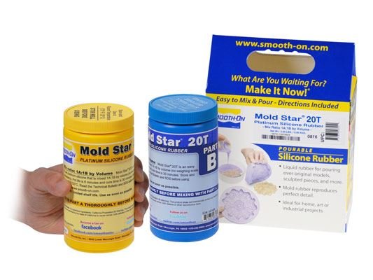 Mold Star™ 20T is an easy to use Shore 20A translucent platinum silicone that is mixed 1A:1B by volume (no weighing scale necessary). It features a relatively low viscosity and vacuum degassing is not required for most applications. Pot life is 6 minutes and cure time is 30 minutes at room temperature.FeaturesMold Star™ 20T cures in to a soft, strong rubber that is tear resistant and exhibits very low long term shrinkage. Molds made with Mold Star™ will last a long time in your mold library and are good for casting wax, gypsum, resins, and other materials. An infinite number of color effects can be achieved by adding Silc Pig™ silicone pigments or Cast Magic™ effects powders.Mold Star™ 20T is heat resistant up to 232°C and is suitable for casting low-temperature melt metal alloys.Cured Mold Star™ 19T, 20T and 31T silicones have been tested and certified skin safe by an independent laboratory.Note: This product will not cure against surfaces containing sulfur, even when sealed. Mix Ratio By Weight & Volume 1A:1B - Specific Volume 25.6 cu. in./lb - Color Translucent - Shore Hardness 20 A - Elongation @ Break 740 %